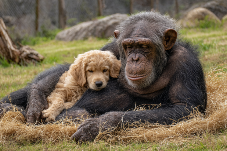 The staff stood frozen, barely believing what they were witnessing. Lulu leaned forward and carefully gathered the puppy into her arms, holding it to her chest the way she would an infant chimp. She began to groom its soft fur, a powerful gesture of care and connection. One of the senior zookeepers turned away, blinking back tears—he understood exactly what this meant.