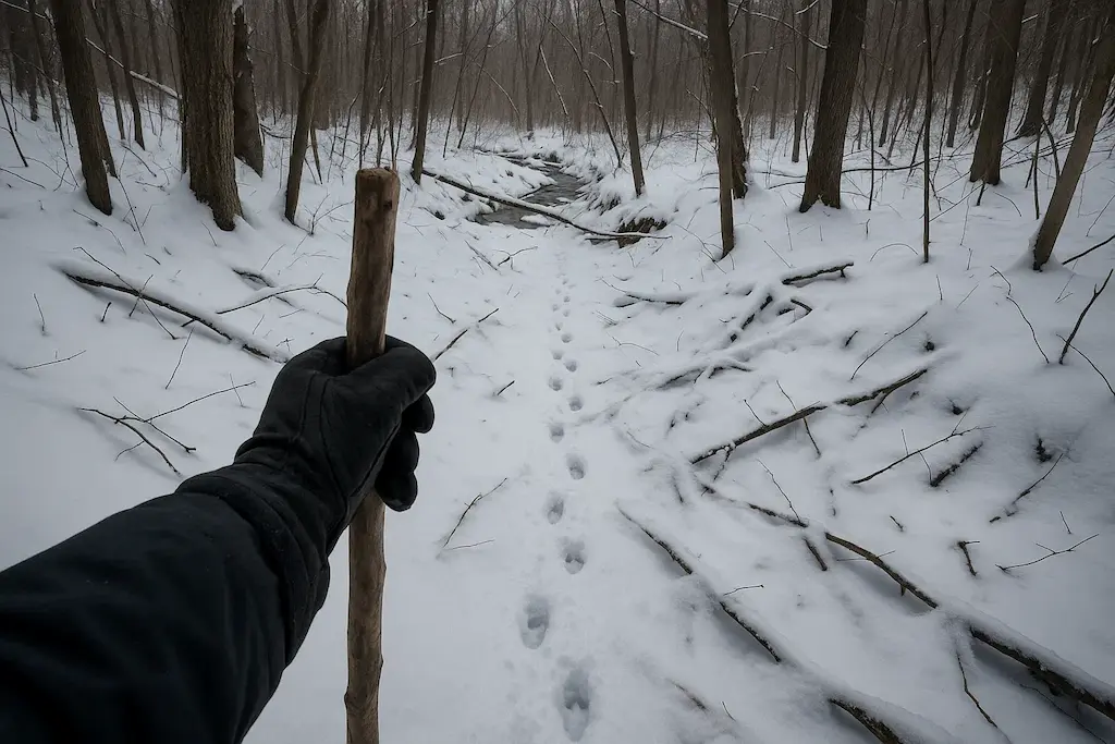 He climbed through the gap and kept following the prints, his breath forming clouds in the frigid air. The path dipped sharply into a small ravine, and there — at the bottom — he found them.