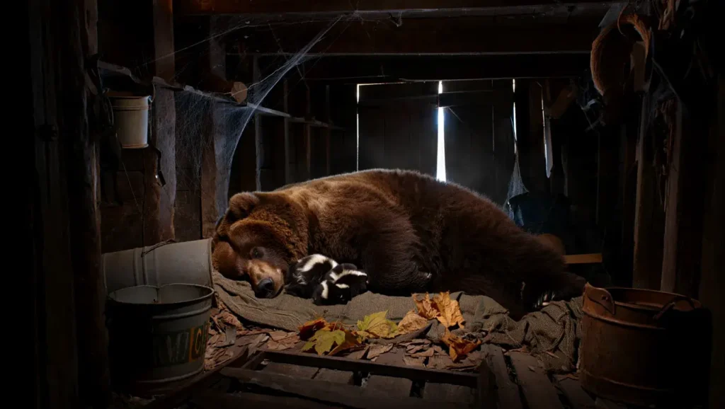 Heart pounding, she watched from a distance as the animal shifted, groaning with the effort of waking. But before it finally pushed its massive body upright and lumbered toward the door, something remarkable happened. The bear nudged at a corner of the blanket pile with its nose, uncovering what lay beneath.